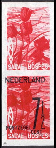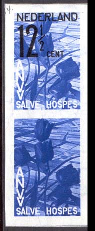 Als laatste de postzegel van 12½ cent. De bollenvelden en de tulpen mochten niet worden vergeten. Een luchtfoto van de bollenvelden en een rangschikking van enkele tulpen maken het plaatje compleet.