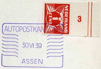 Een kaarttelegram van het hoofdbestuur der P.T..T. van 27 juli 1939 luidt: Bij gelegenheid van T.T.-races te Assen wordt autopostkantoor op 30 Juni en 1 Juli a.s. aldaar als tijdelijk bijpostkantoor in dienst gesteld. Ter post bezorgde correspondentie en aangenomen stukken worden van een afdruk van een speciaal voor het autopostkantoor vervaardigd stempel voorzien.