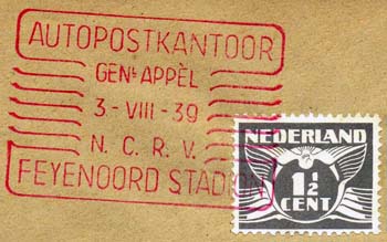 Op 3 Augustus was het Autopostkantoor in het Feyenoord Stadion te Rotterdam opegesteld gedurende de N.C.R.V.- landdag. Hier werd gestempeld met rode inkt.
