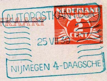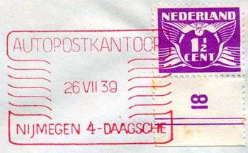 Bericht nummer 3642 van den Pers- en Propagandadienst der P.T.T. van 19 Juli 1939 luidt: P.T.T.op de Vierdaagsche. Het autopostkantoor der P.T.T. zal tijdens de 4-daagsche afstandsmarschen van 25 t.m. 28 Juli a.s. op het terrein van de Prins Hendrikkazerne te Nijmegen worden opgesteld. Er zal een tijdelijk bijkantoor voor de post-, telegraaf- en telefoondienst in zijn gevestigd. De aldaar geposte correspondentie zal, als gebruikelijk, van het speciale stempel, van dit rijdend postkantoor worden voorzien.