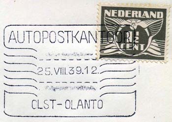 De Mededeelingen van het hoofdbestuur der P.T.T. nr: XXXII van 9 Augustus 1939: Tijdens de van 24 t..m. 27 Augustus a.s. te houden Nationale Landbouw-, Tuinbouw-, Vee- en Industrietentoonstelling te Olst zal aldaar het autopostkantoor in dienst worden gesteld, waarin een tijdelijk bijkantoor voor den P.T.T.-dienst zal zijn gevestigd. De stukken, welke in de brievenbus van het autopostkantoor worden gepost, zullen van een afdruk van den dagteekeningstempel van dat kantoor worden voorzien. De stempel in het reeds bekende type vermeldt bovenin AUTOPOSTKANTOOR, in het midden de datum, bijv. 24.VIII.39.11 en beneden OLST – OLANTO. OLANTO betekent: Olst LANdbouw TenTOonstelling.