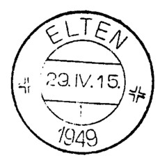 Als voorbeeld Elten. Eerst werd gebruik gemaakt van een rubber stempel met de naam ELTEN. Dit stempel werd enkele dagen gebruikt om postzegels te stempelen met zwarte of violette inkt.
