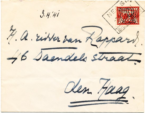 De afgebeelde brief is gedateerd 1 april 1941 en werd aangeboden aan het loket van het NS station te Bilthoven. De brief werd met de trein naar Den Haag vervoerd en door het spoorwegpersoneel overgedragen aan de PTT. Die bestelde de brief op 3 april 1941, gezien de aantekening op de brief, want een afdruk van een poststempel ontbreekt.