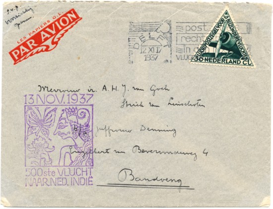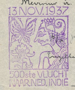 Maar terug naar de filatelie. De 500ste vlucht werd uitgevoerd met het KLM toestel Reiger gevlogen door piloot E.E. Hulsebos en copiloot P. Noomen. Aan boord bevond zich 477 kg post. Het vliegtuig vertrok op 13 november 1937 en arriveerde in Bandoeng op 19 november 1937. Een lege envelop en een brief die daar niet heeft ingezeten. Toch behoren ze bij elkaar, want met de gegevens op de envelop en de tekst in de brief is te reconstrueren wat ermee is gebeurd. Zo krijgt een ogenschijnlijk gewone envelop toch een extra dimensie, komt de envelop weer tot leven! En dat geeft verdieping aan de filatelie, maakt het toch wel spannend.