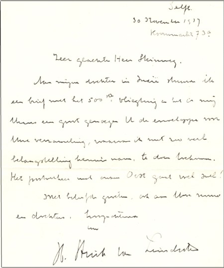 Soms bevinden zich nog brieven in de enveloppen. De inhoud van de brief geeft wel eens een indruk van wat men van de luchtpostdienst dacht. De afzender van de brief schreef: “Zeer geachte heer Steinweg, Voor mijn dochter in Indië stuurde ik een brief met het 500ste vliegtuig en het is mij thans een groot genoegen U de enveloppe voor Uwe verzameling, waarvan ik met zoo veel belangstelling kennis nam, te doen toekomen. Het postverkeer met onze Oost gaat wel snel! Met beleefde groeten, ook aan Uw vrouw en dochter, hoogachtend Uw H. Strick van Linschoten.” De brief, gedateerd 30 november 1937, zat echter niet van oorsprong in de envelop, dus zal deze samen met de envelop in een andere envelop hebben gezeten en zo terug naar Nederland zijn gezonden.