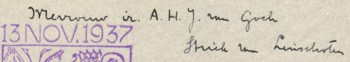 Overigens was het via internet vrij eenvoudig om de geadresseerde op de envelop te traceren: Mevrouw Anna Strick van Linschoten (geboren op 15 juli 1910 te Rijswijk Zh en overleden op 20 augustus 2004 te Dalfsen) was op 8 augustus 1930 te Delft bij volmacht gehuwd met Ir. Arnold Henri Jozef van Goch (1903-1977). Zij had de titel Jonkvrouw. Het echtpaar had drie kinderen, geboren in 1931, 1932 en 1937.