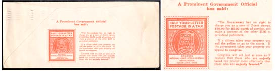 Het zegeltje gaf aan in een slogan aan, dat de helft van het briefport betaald door middel van postzegels in feite belasting was! De uitleg vond ik op internet toen ik de zoekterm National One Cent Letter Postage Association in tikte.