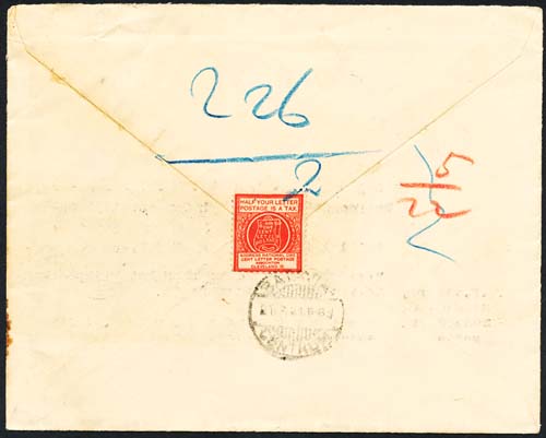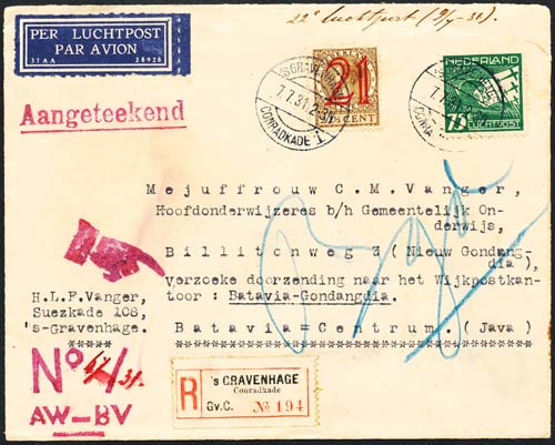 De heer (of mevrouw) Vanger was duidelijk een filatelist die interessante poststukken samenstelde. Etiketjes Luchtpost en Aantekenen, diverse stempels en waarschijnlijk een zelfgemaakt handje. En tot slot nog een (toevallig bij de hand hebbend) sluitzegeltje achterop plakken.