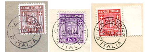 Het was een eenvoudig stempel met alleen de datum. Deze datum was wel verstelbaar. Zegels afkomstig van de eerste oplage kunnen dan ook gemakkelijk worden herkend aan de datum in de stempelafdruk. De zegels waren alleen geldig in Campione zelf maar ook in Zwitserland. De zegels werden niet erkend door de Wereld Postvereniging, de UPU.