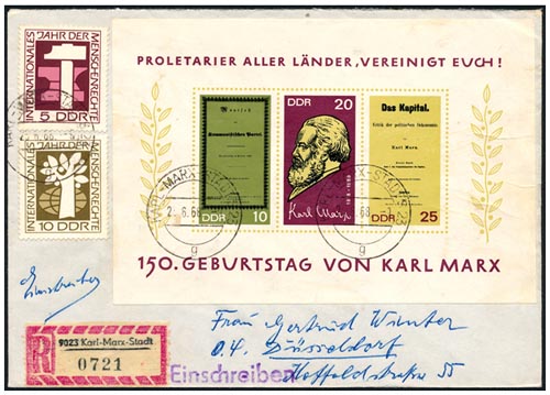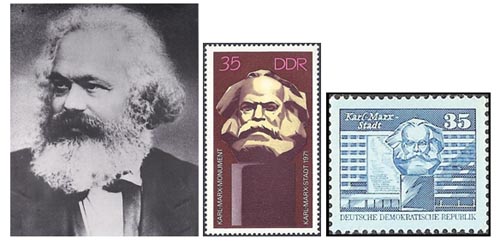 Karl Marx werd op 5 mei 1818 in Trier geboren. Hij heeft heel veel invloed gehad op politieke filosofie en was een van de grondleggers van arbeidersbeweging. In de geschiedenis van het socialisme en communisme was hij een van de centrale figuren. Hij overleed in Londen op 14 maart 1883 en ligt begraven op het kerkhof te Highgate, Engeland. In Karl-Marx-Stadt staat een enorm borstbeeld dat werd afgebeeld op een postzegel die werd uitgegeven op5 oktober 1971. Op 13 mei 1980 verscheen nog een postzegel met het borstbeeld.