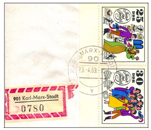 Als verzamelaar van afdrukken van poststempels viel het me op dat de nummers en letters in de stempels van Karl-Marx-Stadt met elkaar correspondeerden. Zoals op bovenstaande envelop uit 1968 is te zien: stempel Karl-Marx-Stadt 23 met aantekenstrook 9023. De letter g onderin het stempel had geen relatie met het strookje.