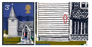 Voor de postzegel van 3 Pence werd een tekening gemaakt van de kerk van Saint Andrew in het dorpje Greensted, vlak bij het marktstadje Chipping Ongar. De kerk is uit de Angelsaksische tijd en wordt beschouwd als de oudste houten kerk ter wereld die nog bestaat. De kerk werd opgetrokken met gebruik van dikke eikenhouten planken en balken en testen hebben uitgewezen dat de oudste balken dateren uit het jaar 845 na Christus. Het meeste hout dateert echter uit de 11de eeuw. Het koorgedeelte van de kerk is in steen opgetrokken tijdens de regering van Koning Henry VII in de Tudor stijl, terwijl de houten toren werd toegevoegd in de vroeger 17de eeuw.