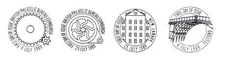 De officiële stempels voor de eerste dag van uitgifte tonen slechts twee toepasselijke afbeeldingen, het bezoekerscentrum in New Larnak en de ijzeren brug in Ironbridge.
