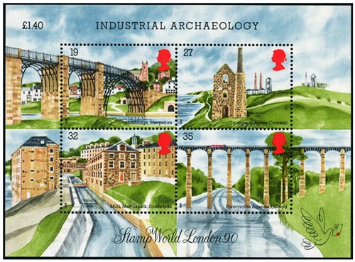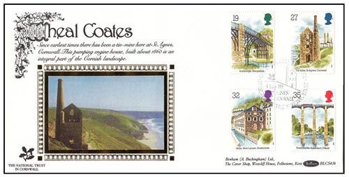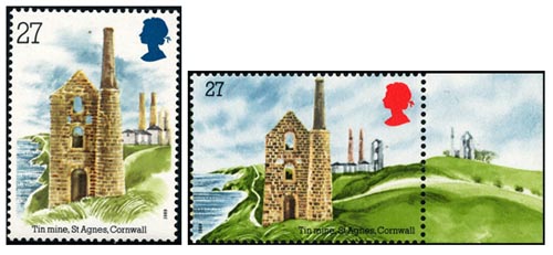 Op de postzegel van 27p is het ruïne te zien van de machinekamer en ketelhuis van de Wheal Coates tinmijn in Cornwall bij de plaats St. Agnes af te beelden. In het gebouw was een grote pomp geïnstalleerd om water uit de tinmijn te pompen. De volledige naam van het gebouw was: Towanroath Shaft Pumping Engine House. Het gebouw werd in 1860 opgetrokken en in 1872 in gebruik genomen om de meer dan 180 meter diepe mijnschacht droog te houden. Naast het gebouw waren nog twee andere machinekamers maar deze zijn niet op de postzegels te zien. De gebouwen op de achtergrond met de twee schoorstenen zijn ontsproten aan de fantasie van de ontwerper. De tinmijn werd gesloten in 1889 omdat deze was uitgeput. Tussen 1911 en 1913 werd de mijn toch nog even in gebruik genomen maar de opbrengst aan tinerts was zo laag, dat de mijn definitief werd gesloten. De machines in de gebouwen werden verwijderd. Nu is het gebouw in beheer bij de National Trust en daardoor zeker gesteld voor de toekomstige generaties.