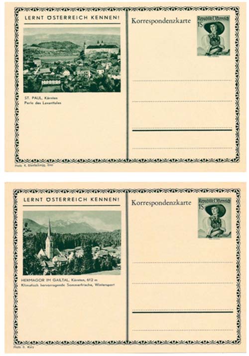 Na 1918 werd het gebied verdeeld over drie landen: Slovenië (Koroška), Italië (Carinzia) en Oostenrijk zelf (Kärnten). Dat ging niet zonder slag of stoot. Het toenmalige Koninkrijk Zuid-Slavië (Joegoslavië) eiste na de oorlog het zuidelijke deel van Karinthië op, omdat meer dan de helft van de bevolking aldaar Sloveens sprak. Maar tijdens de vredesconferentie werd besloten om een volksstemming te houden omdat men in feite om economische en strategische redenen niet wilde dat het gebied werd opgesplitst. De regering in Belgrado was bang dat de uitslag van een dergelijke volksstemming nadelig zou aflopen en bezette daarom het gebied tot aan Klagenfurt. De geïllustreerde briefkaarten laten St. Paul zien dat in het Oost-Karinthië ligt in het Lavanttal en Hermagor in het Gailtal. De twee kaarten zijn in 1956 uitgegeven in een serie van 444 stuks in de waarde van 1 Shilling waarvan een aantal met afbeeldingen van plaatsen en dorpen in Karinthië.