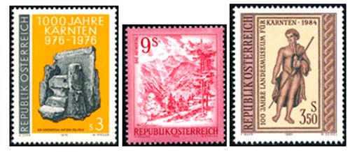 Enkele postzegels gewijd aan Karinthië verschenen op 6 mei 1976 (de Hertogstoel op het Zollfeld), op 9 februari 1983 (Asten) en op 1 juni 1984 (afbeelding van Dionysius, mozaïek uit de Romeinse tijd).