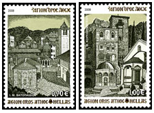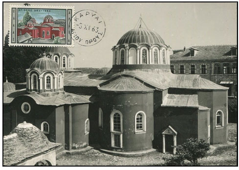 Bovenstaande maximumkaart toont een van de twintig kloosters, het hoofdgebouw van het klooster Megisti Lavra. De Griekse post heeft enkele malen postzegels uitgegeven met afbeeldingen met betrekking tot de Berg Athos. Zoals in 1963 ter gelegenheid van het duizendjarige bestaan van het oudste klooster en van kloosters die daarna zijn gesticht.