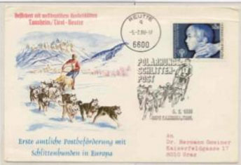 Een geregelde postdienst van met trekhonden bespannen sleden bestond rond Fort Yukon in Alaska tot het eind van de jaren 1950, maar deze werd omstreeks 1960 vervangen door een regionale luchtdienst. Tot nu toe worden echter nog steeds gelegenheidstochten gemaakt door de Alaska Dog Team Post. In 1896 ontdekten twee indianen uit het dorp Caribou Crossing dat ligt in het ‘Yukon Territory’, in het Klondike gebied goud. Een volksverhuizing die voor het gebied ongekend was, kwam op gang. Doorgewinterde mannen, maar ook stedelingen, en andere onervaren types, hadden maar twee zaken in hun hoofd: goud vinden en op de hoogte blijven van het reilen en zeilen van hun achtergebleven geliefden. Er waren geen transport mogelijkheden. Zomers via de rivier en ’s winters per hondenslee. De postbodes waren hun levenslijnen. De enveloppe, die is verstuurd vanuit Caribou Crossing via de ‘White Pass’ naar Atlin, het voormalige centrum van de gouddelving, is uitgegeven ter herinnering aan die toegewijde mannen, postbodes, onbezongen helden, die met inzet van hun leven, ongeachte de barre omstandigheden, de levenslijnen open hielden.