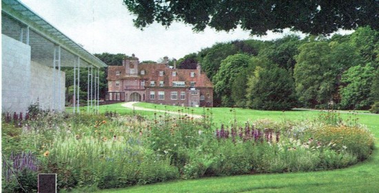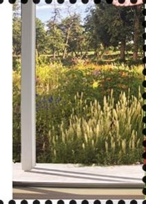 Door de grote ramen en de ‘het-museum-omringende’ tuinen (van tuinarchitect Oudolf) zijn vanuit het museum de tuinen heel goed zichtbaar. Vanuit de tuinen zijn de museumobjecten ook duidelijk zichtbaar. Op bijgaande foto is de eerste postzegelafbeelding ‘(Couple under an Umbrella) nog te onderscheiden. Integratie. Met andere woorden cultuur en natuur ondersteunen elkaar over en weer op een aantrekkelijke manier. Zie daarvoor ook de afbeelding op de 2e tab linker afbeelding.