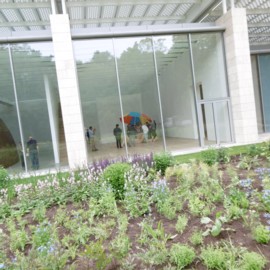 Dankzij de grote glazen wanden zijn de tuinen ook van binnen het gebouw te zien. Daardoor werken kunst, architectuur en natuur geïntegreerd sterk op elkaar in.