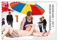 Een ouder echtpaar zit/ligt te genieten van het zomerse weer onder een vier-kleurige parasol. Ze behoren door hun grootte van bovenmenselijk formaat en schaal bepaald niet tot onze wereld. Hun formaat en omvang zijn bijna twee keer die van een gewone sterveling. Op de zegelafbeelding is de imponerende grootte moeilijk vast te stellen, terwijl een vijftal museumbezoekers toch enige mogelijkheid tot vergelijking geven.
