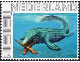Tijdgenoot van onze mosasaurus was de Tyrannosaurus rex. Terwijl de Mosasaurus boven Maastricht in de T.rex rond in de buurt van Leiden. Maar daar vind je niets meer uit die tijd, want het land is daar gezakt, te diep, dus hebben ze in Leiden een expeditie naar Amerika gestuurd om er een te vinden en deze uit te graven en van een lokale boer te kopen. Zo komt deze T.rex in Leiden. Om reclame te maken voor het museum Naturalis, heeft dit museum hun T.rex met de aimabele naam Trix, op een postzegel gezet. Maar het is en blijft een Amerikaan.