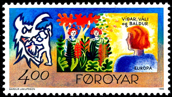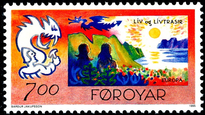 Op dezelfde dag, 10 april 1995, verschenen twee Europazegels met als onderwerp ‘Vrede en Vrijheid’. De zegels waren ontworpen door Bárdur Jákupsson. Op de eerste zegel beeldde hij ‘De nieuwe wereld – Lív en Lívtrasir’ uit. Op de tweede zegel ‘De nieuwe wereld – terugkeer van de Goden’. In de Scandinavische mythologie zijn Lív en Lívtrasir de laatste twee mensen die de ‘Ragnarök’, de vernietiging van de aarde, overleven en de nieuwe wereld gaan bevolken.