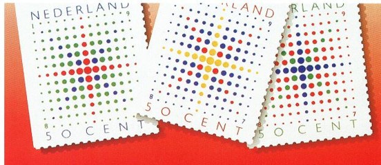 Met enige fantasie zou je kunnen stellen dat op de ietwat schuinstaande Decemberzegels 1987 (in de Stijl-kleuren rood, geel en blauw) striptekenaar Jan Kruis veertig jaar eerder al met een monogram van zijn achternaam al op postzegels terecht is gekomen.