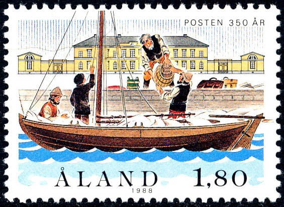 De eerste postzegel verscheen op 4 januari 1988 en was gewijd aan het 350-jarige bestaan van de postdienst op de Åland eilanden. Het ontwerp was vervaardigd door Pirkko Vathero. De postdienst op de eilanden werd vanaf 1638 verzorgd door de Zweedse posterijen. Op de eilanden bevonden zich toen twee postkantoren, een in Kastelholm en de andere in Eckerö. In 1866 werd pas het derde postkantoor geopend. Dat was in Mariehamn. In de periode dat Finland en Åland het groothertogdom Finland vormden, werd de postdienst vanaf 1809 uitgevoerd door het Russische Keizerrijk. De meeste andere postkantoren werden geopend op het einde van de 19de eeuw en begin 20ste eeuw. Vanaf 1917 werd de postverzorging geheel door de Finse postadministratie gedaan. Op de achtergrond van de postzegel is het voormalige veel te grote Russische douanekantoor tevens postkantoor uit 1828 afgebeeld in Eckerö. De brieven werden vervoerd in tonnen om te voorkomen dat deze nat werd vanwege de open boten die werden gebruikt.