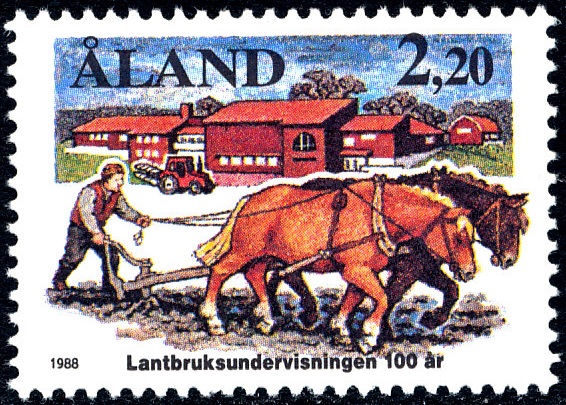 Op 29 maart 1988 verscheen de tweede postzegel van dat jaar om 100 jaar landbouwonderwijs op de Åland eilanden te vieren. Op de postzegel is de landbouwschool te Haga te zien. De school werd in 1987 gerenoveerd. De postzegel werd ontworpen door Tage Wilén. Deze kunstenaar werd in 1941 op Åland geboren en kreeg zijn opleiding in Zweden. Sinds 1969 werkt hij als full time kunstenaar in Åland. Hij is veelzijdig en schildert, tekent en beeldhouwt. Hij geeft les in de schilderkunst en tekenen.
