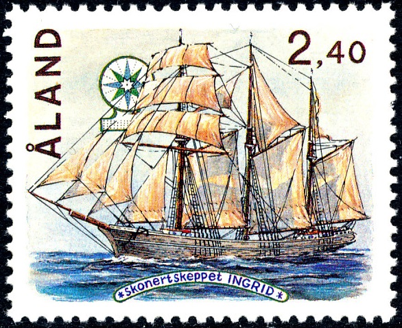 Nog een schoener is afgebeeld op de postzegel van 2,40 mk. Het is een driemaster met de naam Ingrid. Het is het enige schip dat op Åland werd gebouwd en werd aan een Engelse reder verkocht.