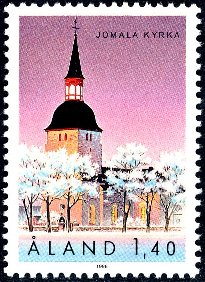 De kerk van Jomala, in het dorpje Prästgården, is de oudste stenen kerk van Åland. De oudste delen dateren uit de 12de eeuw. De toren heeft een hoogte van 52 meter. De kerk is gewijd aan de beschermheilige van Åland, Olav II de Heilige van Noorwegen. De kerk behoort tot de Evangelisch Lutherse Kerk van Finland. De kerk werd gebouwd tussen 1260 en 1280. In de kerk zijn nog muurschilderingen te zien uit de begintijd. In 1844, tijdens de Russische overheersing, werd de kerk uitgebreid. In 1968 werd een glas-in-lood raam aangebracht, geschonken door de Amerikaanse kunstenaar Thure Bengts. De voorouders van Bengts kwamen uit Jomala. Ontwerpster van de postzegel was Pirkko Vahtero en de uitgiftedatum 26 augustus 1988.