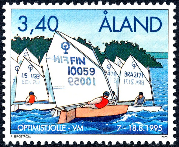 De wereldkampioenschappen Optimist, een type zeilboot, vonden van 1 tot en met 18 augustus plaats. Een Optimist is een eenpersoons jeugdzeilboot met een zeiloppervlak van 3½ m2, een lengte van 2,30 meter en een breedte van 1,15 meter. Kinderen mogen wedstrijdzeilen met de Optimist tot en met het kalenderjaar waarin ze vijftien worden. Bij het wedstrijdzeilen moet in boven in het zeil een zeilteken voorkomen zoals afgebeeld. De postzegel werd ontworpen door Peter Bergström en uitgegeven op 2 juni 1995. Gedrukt door Joh. Enschedé & Zonen.