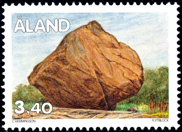 De op de tweede postzegel afgebeelde zwerfsteen, flyttblock genoemd, meegevoerd door een gletsjer. Bij het smelten van de gletsjer werd de enorme rotsblok die afkomstig was uit noordelijke gebieden van Scandinavië, afgezet op de rotsige bodem, soms op een schijnbaar wankele basis.