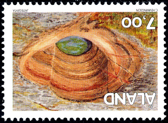 Door de postzegel op zijn kop te houden lijkt het opeens een berg te zijn geworden met op de top een weideveldje! Dit fenomeen kan men ook waarnemen als men de Nederlandse zomerpostzegel uit 1962 met de afbeelding van een fossiel ammoniet op zijn kop houdt. Ontwerper van de postzegels was Charles Hemmingson. Hij vervaardigde vele schilderijen met rotsformaties en rotsige landschappen en kustgebieden.