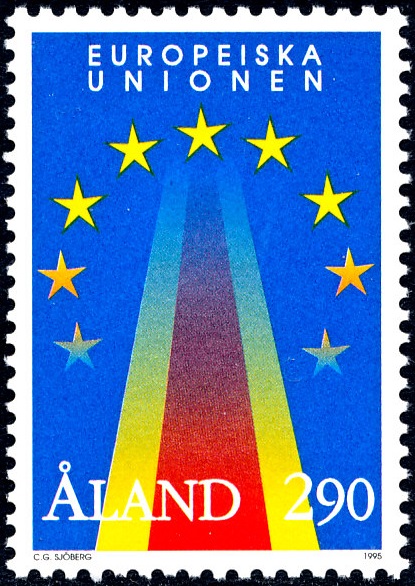 Met ingang van 1 januari 1995 trad Åland samen met Finland toe tot de Europese Unie. Groot verschil is wel dat Åland geen deel uitmaakt van het BTW gebied van de Europese Unie. Dit werd herdacht met een postzegel, uitgegeven op 1 maart 1995, ontworpen door Carl-Gunnar Sjöberg. Het was de eerste postzegel die door Joh. Enschedé & Zonen te Haarlem voor Åland was gedrukt. Er zouden nog vele volgen.