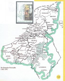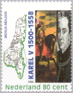 In 1555 neemt Filips II het westelijke gedeelte van het omvangrijk grote Spaanse rijk van zijn vader Karel V over. Dit gedeelte (Zeventien Verenigde Nederlanden) komt bijna overeen met de huidige Benelux. Op de postzegel staan als afbeelding Karel V en Karel V als triomferende ridder-veldheer te paard op een schilderij van Titiaan.