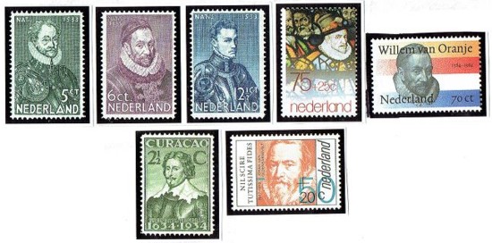 • Vijf postzegels van Willem van Oranje (bijnaam Willem de Zwijger (1533 -1584), nvph 253/55, 1178, 1312) en nog twee postzegelafbeeldingen: