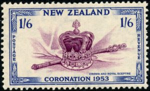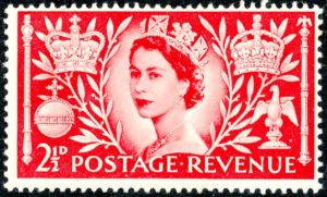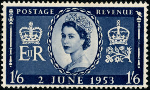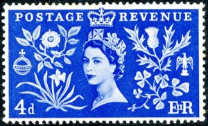 Met een waarde van 1/6D werd een postzegel ontworpen door Michael Farrar-Bell die vooral bekend is door zijn glas-in-lood ramen en uithangborden voor pubs. Op de zegel zijn alleen de kroon van Sint- Eduard, de keizerlijke staatskroon en de nationale bloemen, de roos, distel, narcis en klavertje drie. De postzegel werd goedgekeurd op 21 mei 1953.