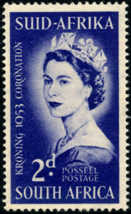 Zuid Afrika gaf op 2 juni 1953 een postzegel uit met de landsnaam in twee talen, Zuid-Afrikaans en Engels. Door de grote oplage, meet dan 47 miljoen zegels, is de postzegel te vinden in de kleuren violetblauw en ultramarijn.