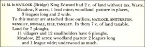 De Latijnse naam Mestesforde werd Matlock. Het is een stadje in Derbyshire in het Peak District dat werd beschreven in het tweede deel van het Domesday Book, ook wel het ‘Great Domesday Book’ genoemd, omdat het eerste deel alleen de graafschappen Norfolk, Suffolk en Essex besloeg. De in de tweede regel genoemde loodmijn bestaat nog steeds en is thans ingericht als museum. De voormalige pompkamer van het kuuroord Matlock Bath laat werktuigen en andere voorwerpen zien die in de mijnen werden gebruikt. Verderop, aan de overkant van de straat, ligt de Temple Mine. En nog verder, op de Heights of Abraham, liggen de ‘Great Rutland Cavern’ en de ‘Great Masson Cavern’, een grottenstelsel met buiten prachtige vergezichten over Matlock Bath en in de verte de ruïne van Riber Castle. Een kabelbaan brengt je naar boven, een onvergetelijke ervaring.