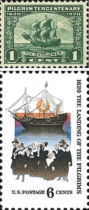 Bovenste zegel is van 1920 en geeft aan de ‘Mayflower’, het schip waar de Pilgrim Fathers in Amerika kwamen 300 jaar geleden. Ze vluchtten Engeland waar ze vervolgd werden. De onderste zegel van 1970 geeft de landing aan van de Pilgrim Fathers in de nieuwe wereld.
