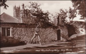 Deze meidoorn, ook wel hagedoorn genoemd, wordt beschouwd als DE meidoorn van Joseph, maar dat is zeer onwaarschijnlijk. De meidoorn in de abdij wordt echter wel de Heilige Meidoorn genoemd. Als men de ruïne van de abdij gaat bezoeken, komt men door het poortje rechts van de meidoorn op de prentkaart. Op het terrein van de abdij ligt een graf dat toegeschreven wordt aan koning Arthur. Op de achtergrond van de kaart de toren van de episcopale kerk van Johannes de Doper. Ook hier staat op het kerkhof een nakomeling van de meidoorn van Joseph van Arimathea.