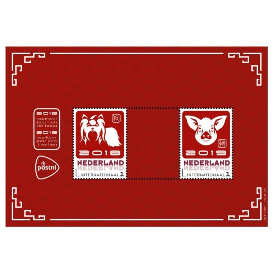 PostNL geeft een aantal jaren ook Chinese dierenriem persoonlijke zegels uit. Links de hond (2018) en rechts het varken (2019).