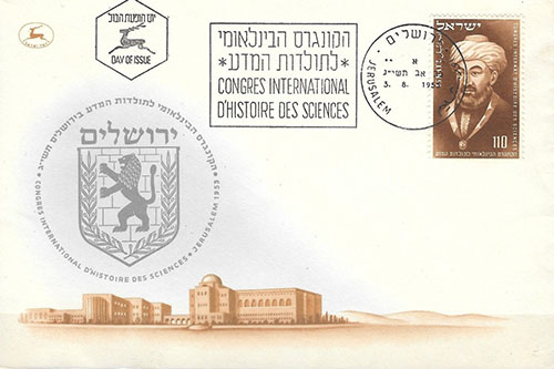 Zegel en stempel uitgegeven ter gelegenheid van een internationaal wetenschappelijk congres in Jeruzalem in 1953.