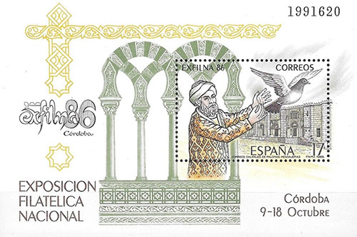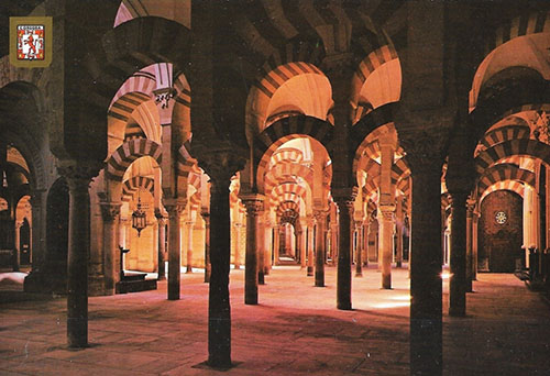 De Mezquita, de beroemde moskee in Córdoba, vormde eeuwenlang het culturele islamitische centrum in Andalusië. Hier doceerden beroemde filosofen en wetenschappers. Afbeelding: Arabische geleerde laat een postduif los Op de achtergrond de gevel van de immense moskee. Onder: gedeelte van de zuilengalerij in de Mezquita.