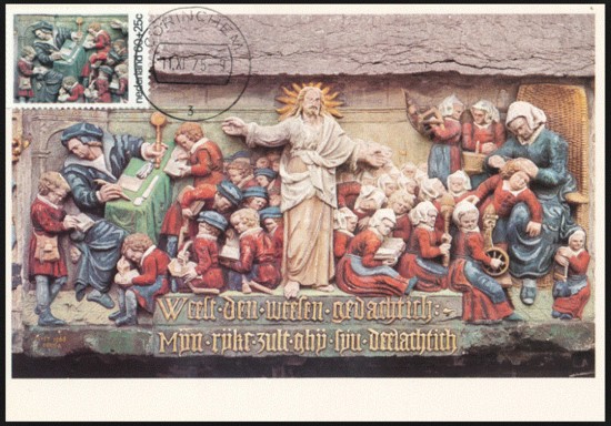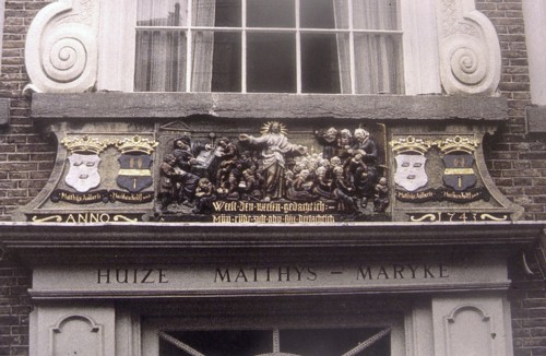 Boven de deur van het burgerweeshuis Huize Matthijs-Marijke aan de Molenstaat 15 in Gorinchem is een reliëfrijk kleurige gevelsteen uit 1558 geplaatst. In het midden van een leslokaal staat Christus met uitgespreide armen. Hij zegt: “Weest den weesen gedachtich: Mijn rijck zult ghij sijn indachtich.” De gevelsteen verbeeldt de bijbelse tekst: “Laat de kinderen tot Mij komen.”