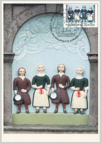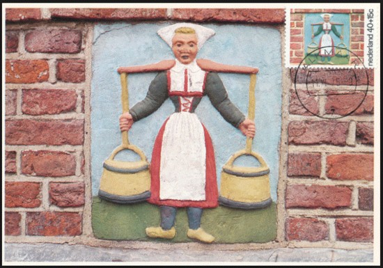 De ruimtelijke foto-afbeelding van het Alkmaarse melkmeisje komt door de schaduwwerking van de zon , stenen met voegen, loodbescherming en kozijnfragment levendiger en levensechter over als de minder reliëfrijke postzegel- en maximumkaartafbeelding.