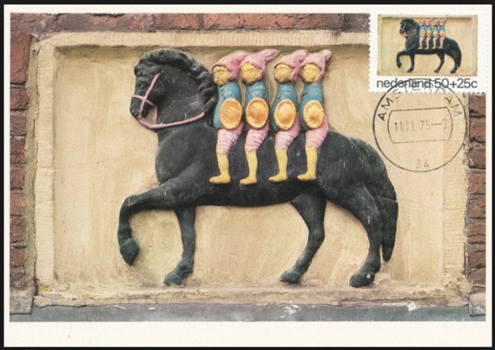Gevelsteen (1785) op een aan pand aan de Herengracht 394 in Amsterdam met de gelijk afgebeelde Heemskinderen Adelaart, Ritsaart, Writsaart en Reinoud (schildknapen) met naar de kijker gerichte hoofden op het zwarte ros Beyaart. De vier kinderen zijn gekleed als geharnaste ridders met helmen en schilden.