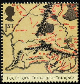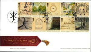 Hij wordt de vader van de fantasieliteratuur genoemd: John Ronald Reuel Tolkien. In 1937 was zijn boek ‘The Hobbit’ verschenen, met groot succes. Op 29 juli 1954 verscheen het eerste deel van een vervolg op zijn fantasieroman met de titel ‘The Fellowship of the Ring’, een trilogie genaamd ‘The Lord of the Rings’. Reden voor Royal Mail om op 26 februari 2004 een serie van tien postzegels uit te geven. Het ontwerp van de postzegels werd verzorgd door HGV Design.